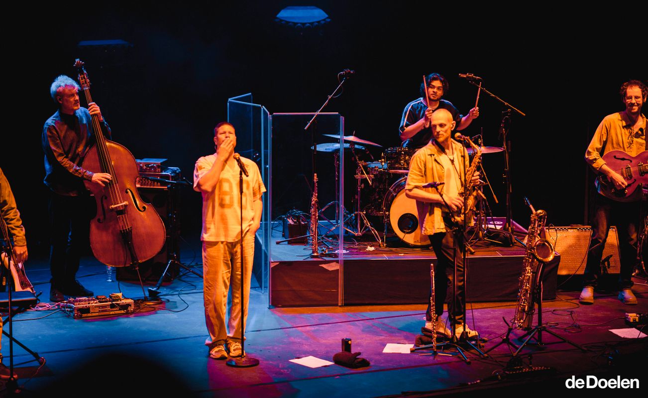 Pete Philly performing with his band in the Jurriaanse Zaal at de Doelen, singing at the microphone with double bass, saxophone and drums in the background.
