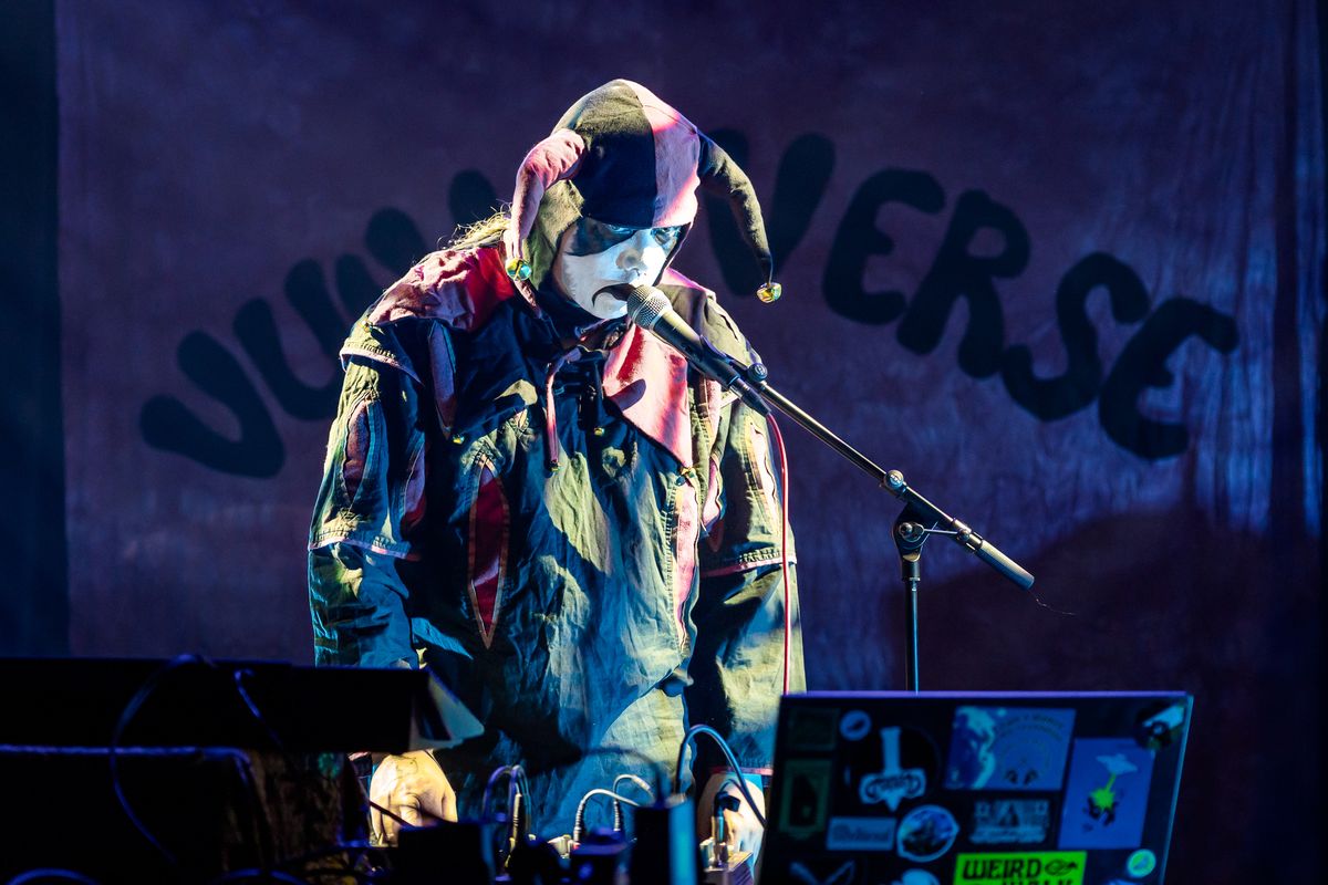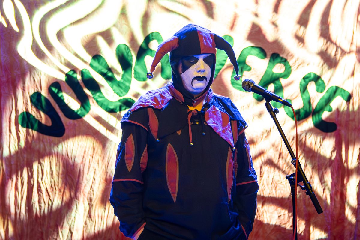 A performer in a jester costume with a painted face stands on stage in front of a microphone during the Vulvaverse music festival by the band VULVA  at de Doelen. In the background, a brightly lit backdrop displays the word “Vulvaverse”.