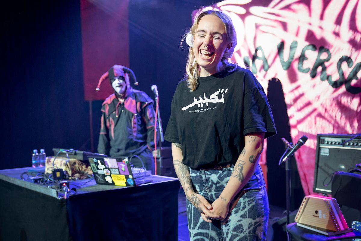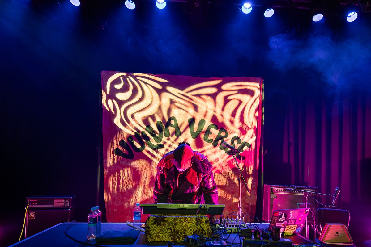 The performer Segadeath  dressed in a jester costume with a white-painted face, stands on stage under dramatic purple and blue spotlights. In front of him are electronic equipment and a snare drum, as he leans over his setup. In the background, a large banner reads ‘VULVAVERSE’. On the right, an attentive audience watches during the experimental music festival Vulvaverse.