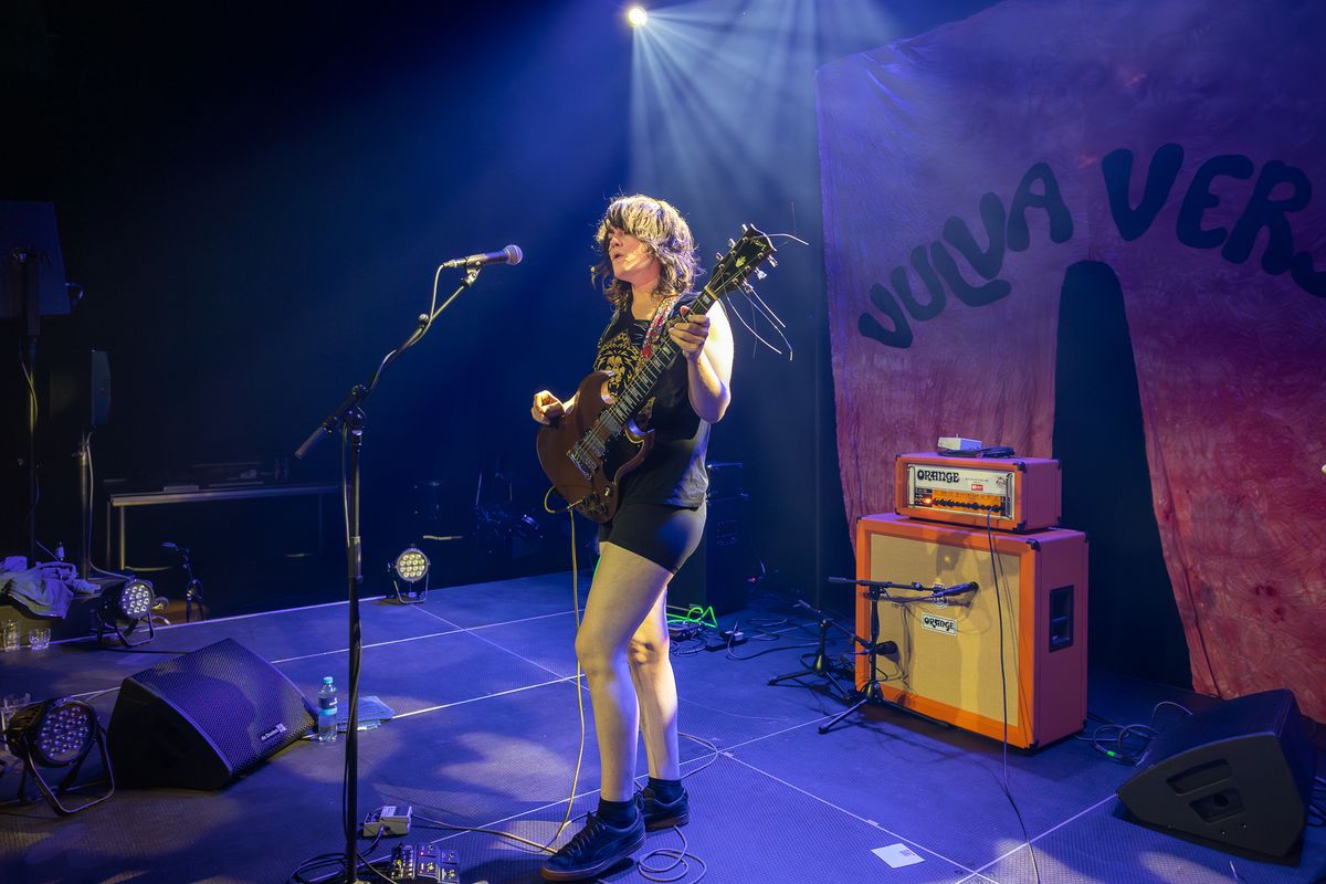 A guitarist from the band Liturgy performs during the Vulvaverse music festival in the Eduard Flipse Zaal at de Doelen. She stands in the spotlight with an electric guitar in front of a backdrop featuring the text ‘VULVAVERSE’. To her right is a large orange amplifier; cables and speakers are scattered across the stage.