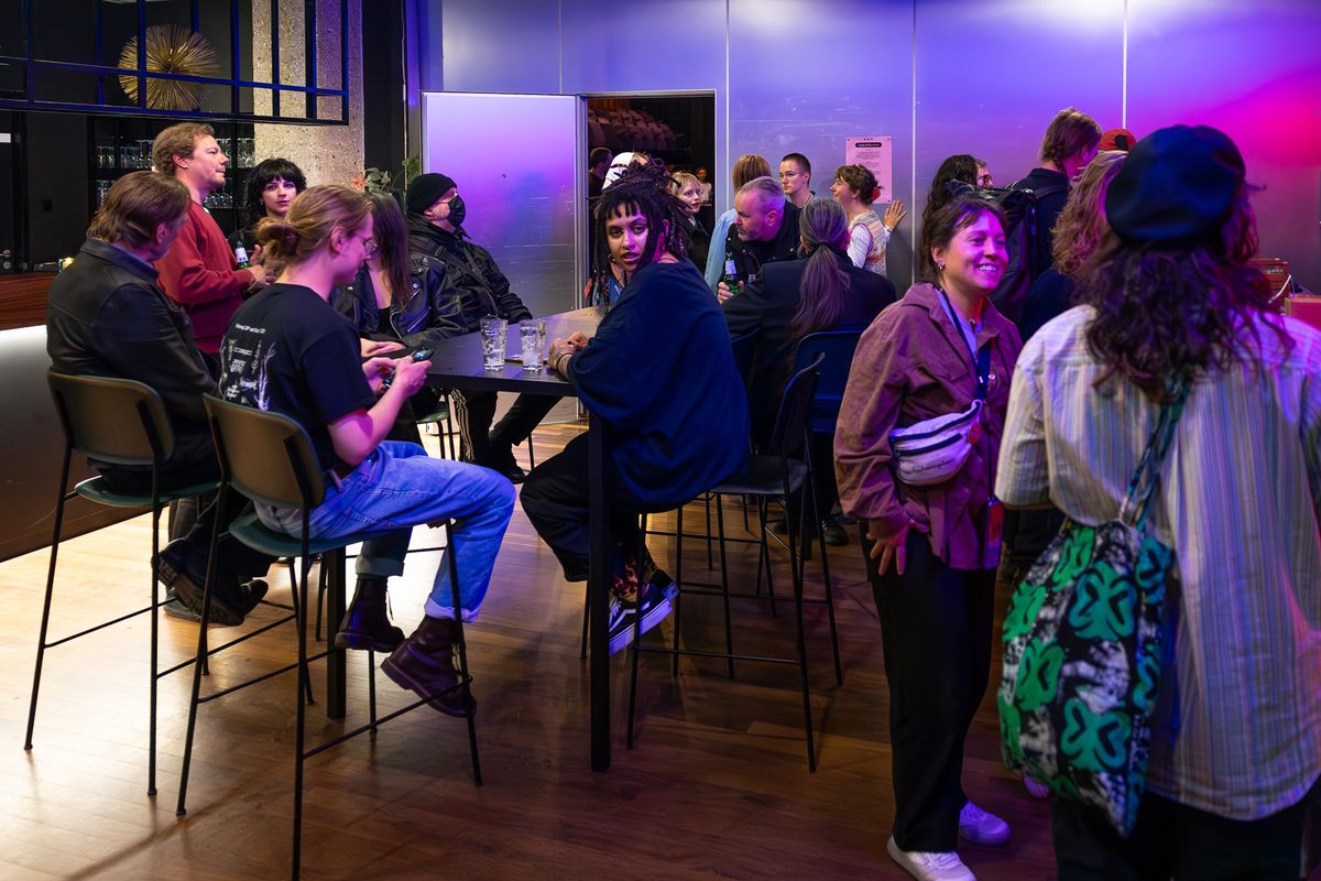 Visitors of the Vulvaverse music festival by the band VULVA gather in the foyer of the Eduard Flipse Hall at de Doelen. Groups of people are sitting and standing casually around high tables, talking and laughing in an atmospheric space lit with purple and blue lighting. The relaxed setting highlights the inclusive and community-oriented spirit of the festival.