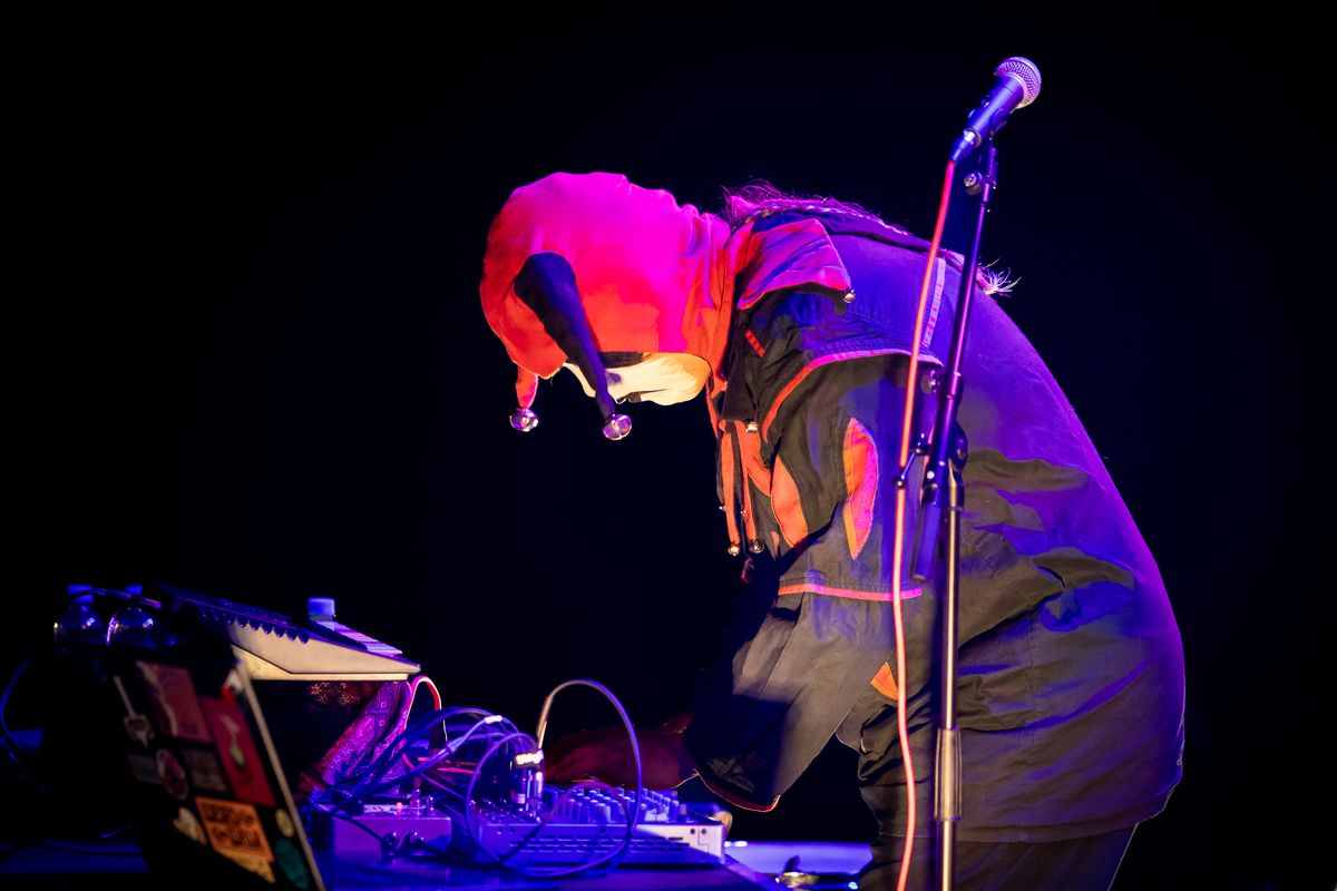 The performer Segadeath in a jester costume with a black and white painted face operates an audio mixer during the Vulvaverse music festival in the Eduard Flipse Zaal at de Doelen. The artist is lit by bright purple and yellow light and is bent over a table with cables, equipment and a sticker-covered laptop. On the right side of the image, a microphone on a stand is visible against a dark background.