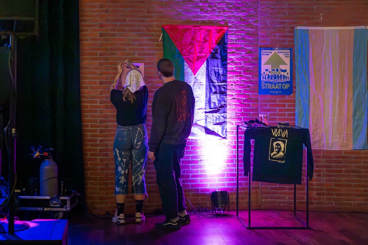 Two staff members of the Vulvaverse music festival are hanging a poster on the wall in the Eduard Flipse Zaal at de Doelen. The brick wall is further decorated with a Palestinian flag, a trans pride flag, and a protest poster. On a high table lies a black VULVA shirt with a printed design. The scene is atmospherically lit with purple hues.