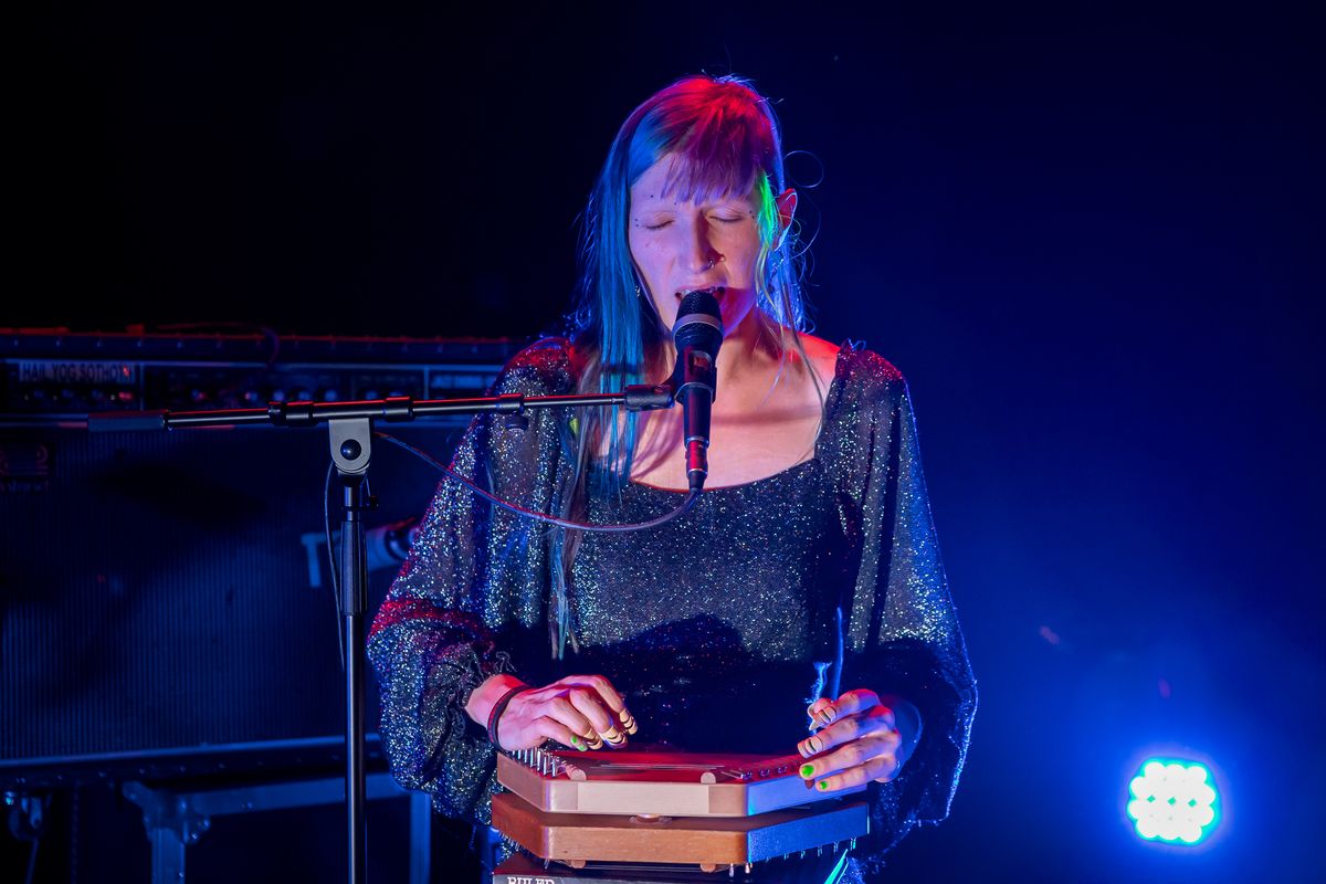 A band member from Tristwch Y Fenywod sings into a microphone while playing a lap harp on stage in the Eduard Flipse Zaal at de Doelen. Dressed in a black dress, she is illuminated by crisp blue lighting that creates an intimate, almost ethereal mood.