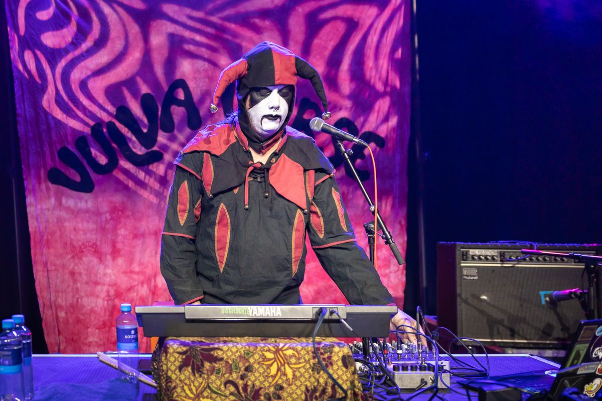 The performer Segadeath dressed in a jester costume with a black and white painted face performs behind a Yamaha synthesizer during the Vulvaverse music festival in the Eduard Flipse Zaal at de Doelen. In the background, a purple-pink banner with the word ‘VULVA’ is visible. Water bottles are placed on the table, which also holds an audio mixer.