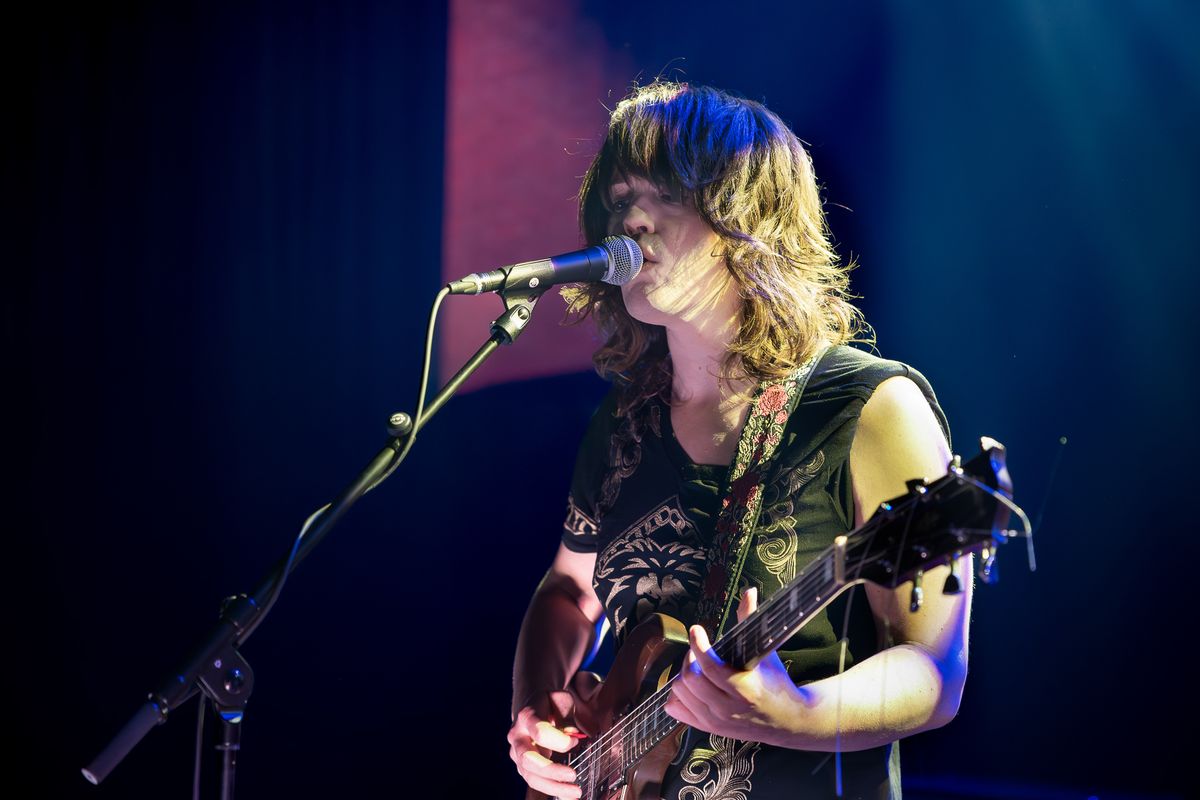 Singer-guitarist of the band Liturgy sings into the microphone during a performance at the Vulvaverse music festival in the Eduard Flipse Zaal at de Doelen. The musician is lit by colorful stage lighting and plays an electric guitar with visibly protruding strings.
