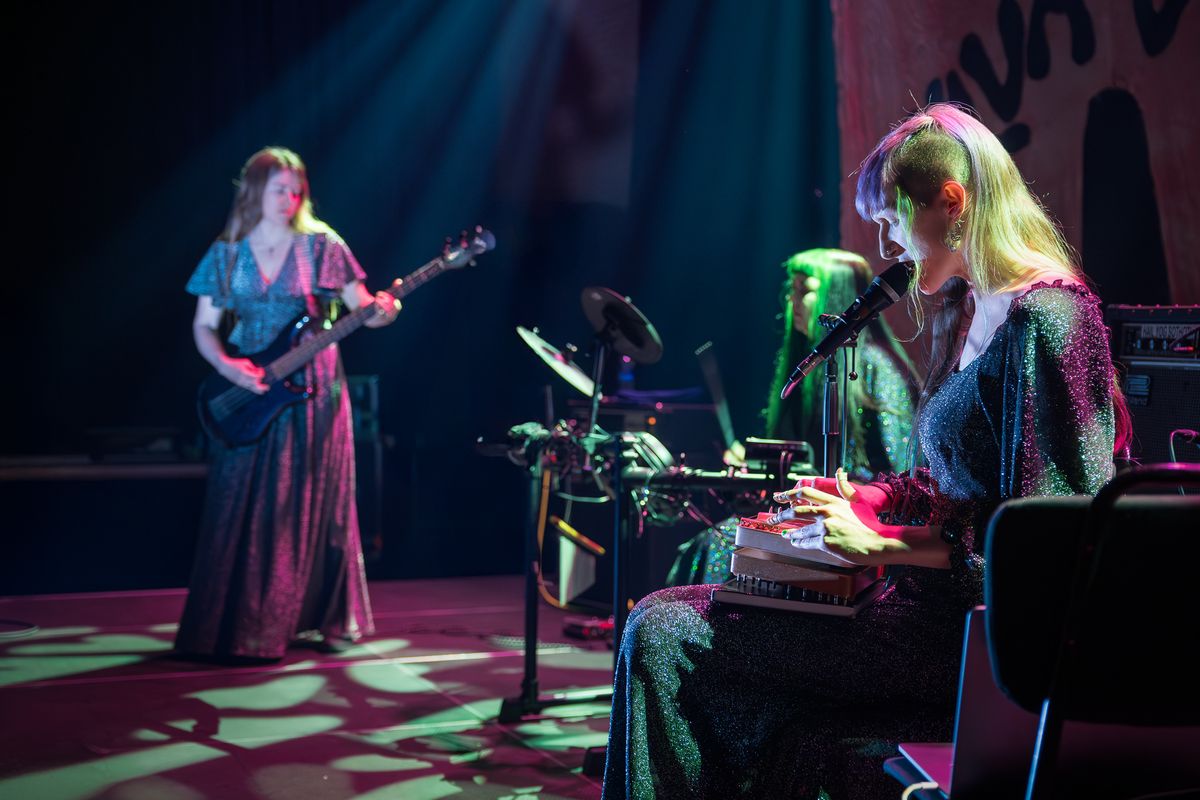 The three bandmembers from Tristwch Y Fenywod performing live in the Eduard Flipse Zaal, colourfully lit during Vulvaverse Presents.