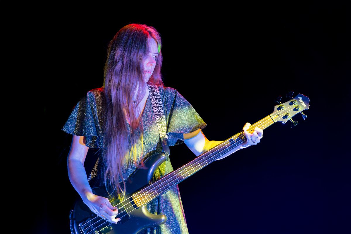 The female bass player from the band Tristwch Y Fenywod stands confidently center stage in the Eduard Flipse Zaal at de Doelen. She wears a long, dark dress and is dramatically illuminated by a green spotlight from above, with warm, swirling light patterns on the floor.