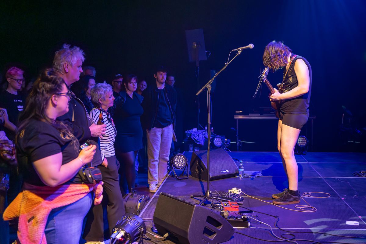 The guitarist of the band Liturgy performs during the Vulvaverse music festival in the Eduard Flipse Zaal at de Doelen. On the left side of the image, the audience watches attentively from close range while the musician plays on the illuminated stage. The atmosphere is intimate and focused.