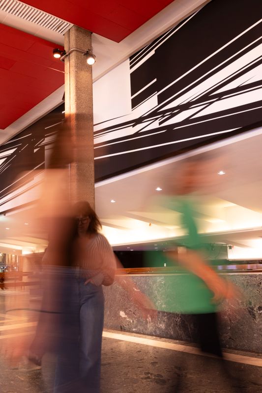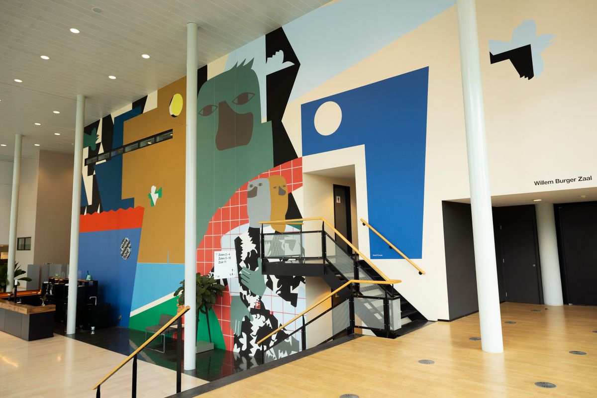 Afgelopen seizoen werd de kunstcollectie in de Doelen uitgebreid met drie nieuwe werken in de publieke ruimtes van het gebouw. Twee muurschilderingen en een textielwerk, gemaakt door Anuli Croon, Sandim Mendes en Christine Rusche, geven nu extra kleur, karakter en ritme aan plekken waar dagelijks bezoekers en makers samenkomen. De realisatie van deze werken werd mogelijk gemaakt dankzij bijdragen van verschillende Rotterdamse fondsen, donaties uit het bedrijfsleven en steun vanuit het Doelen Steunfonds.