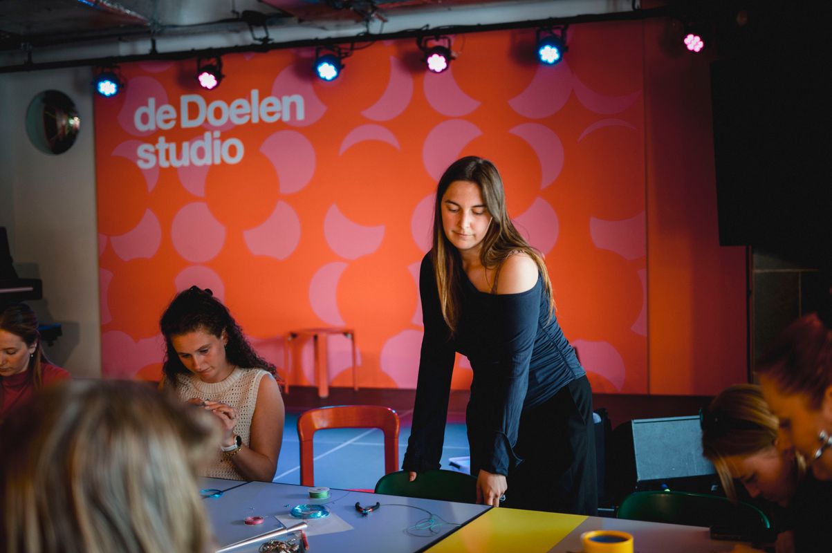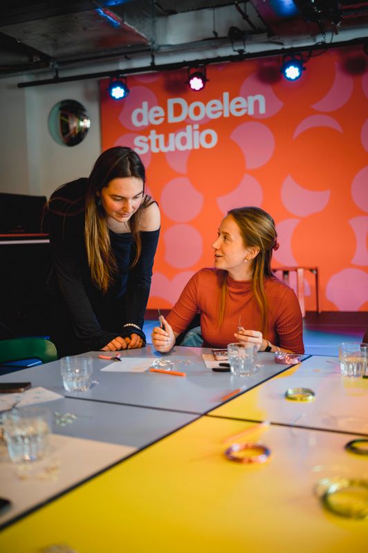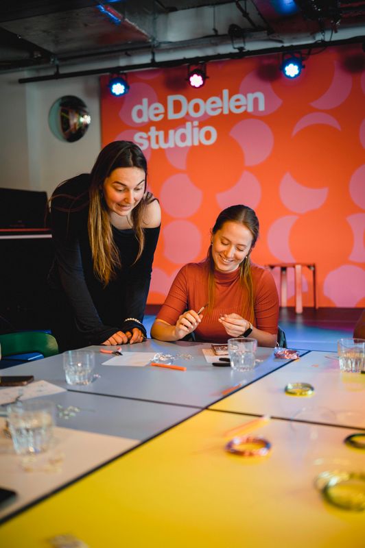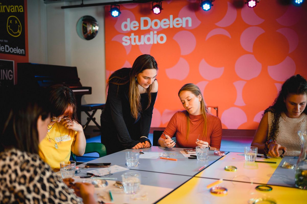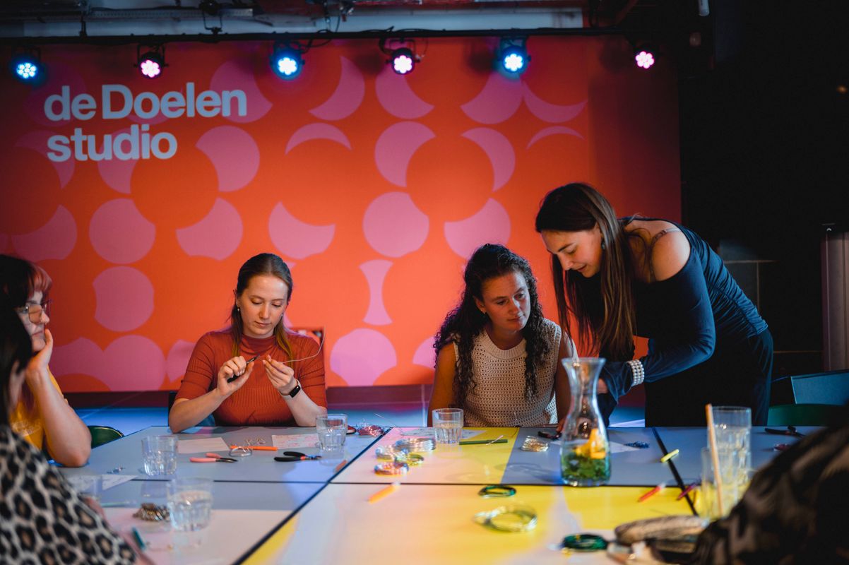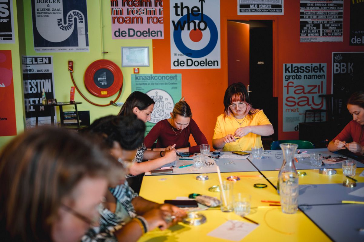 Een serie creatieve sessies in de Doelen Studio: Lilian Beentjes leerde deelnemers sieraden maken van aluminium, met oog voor detail en ruimte voor experiment.