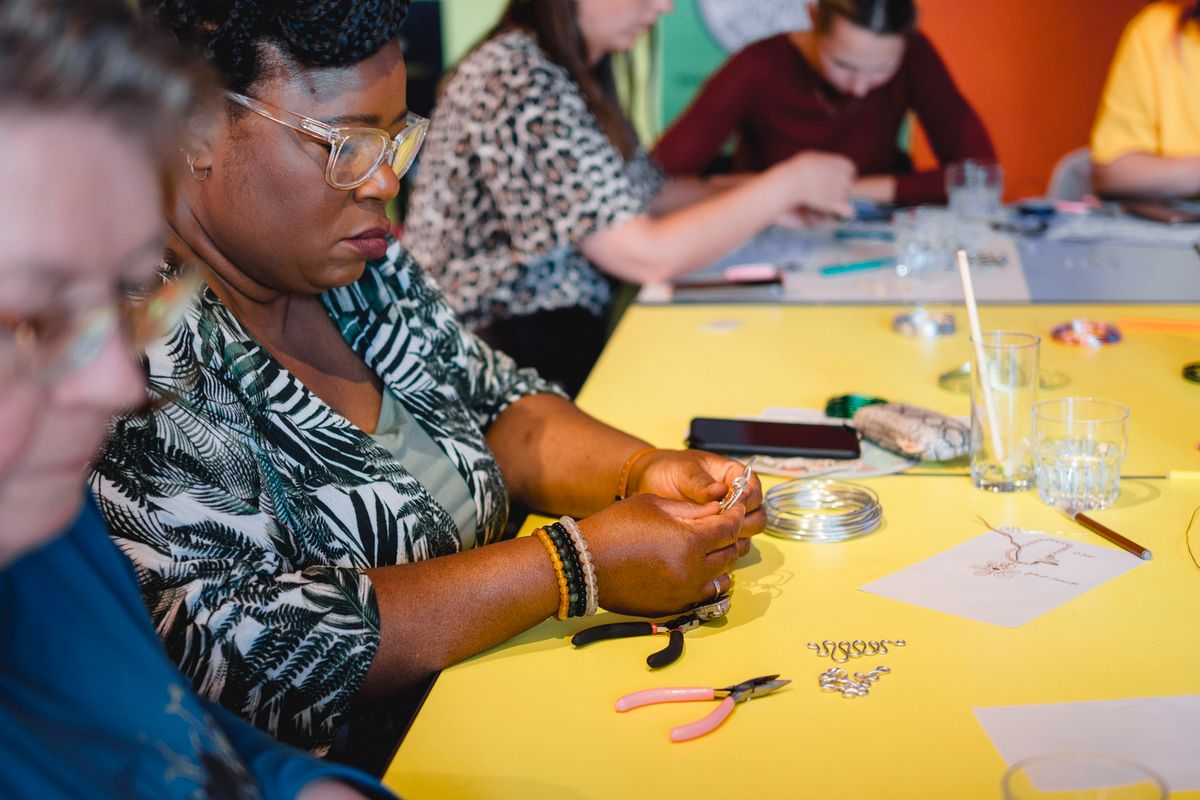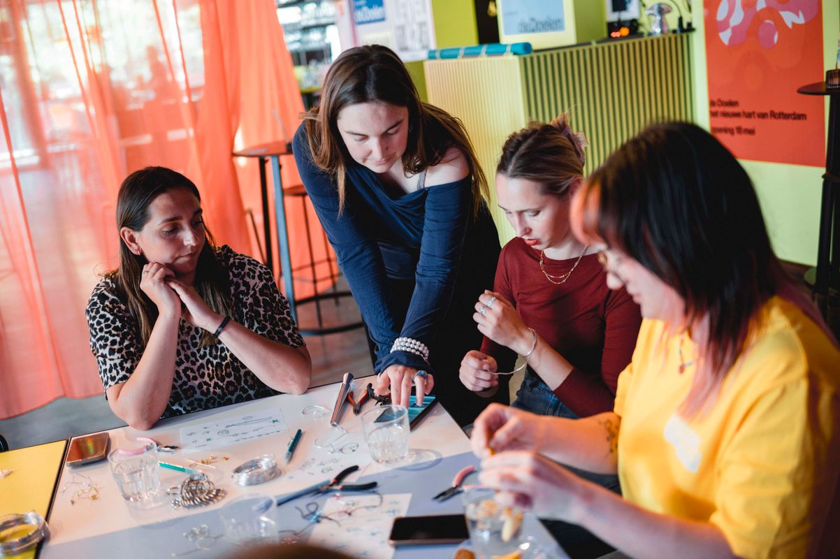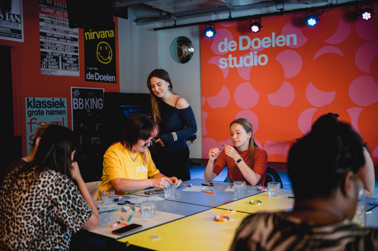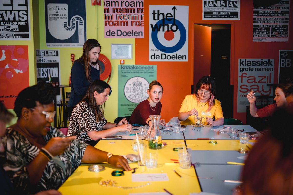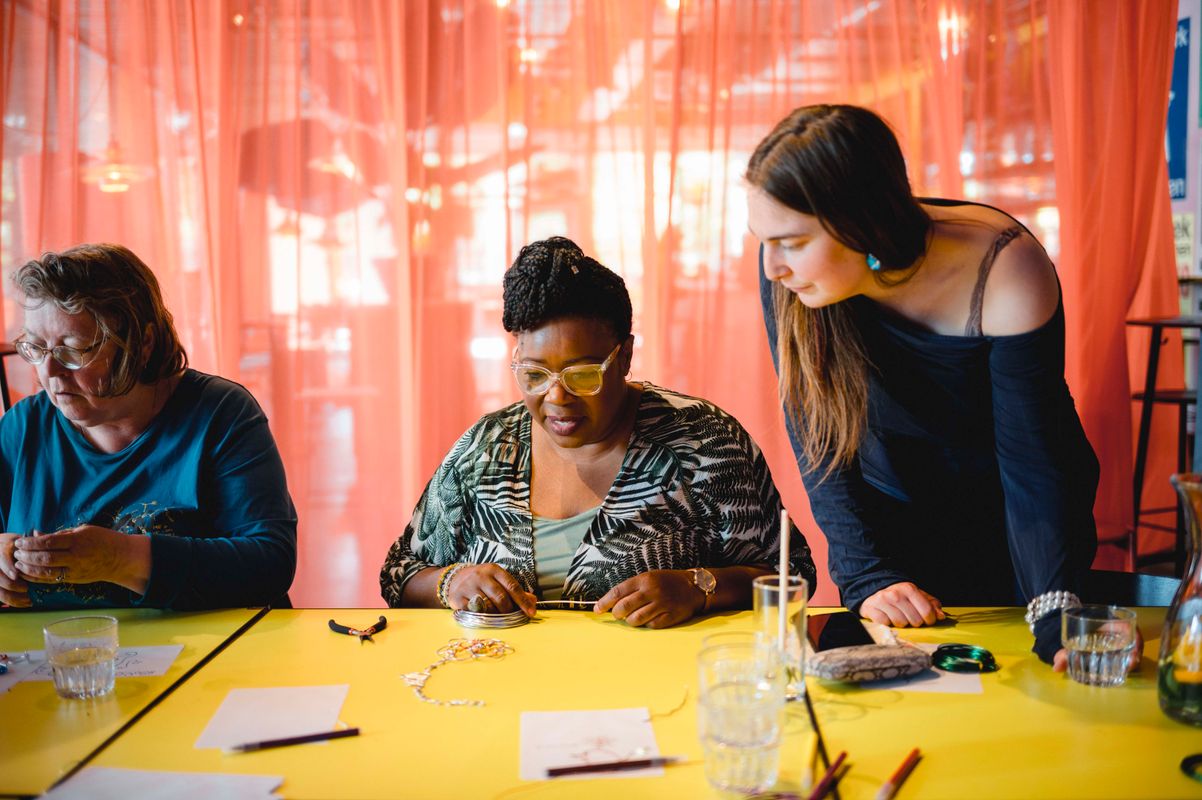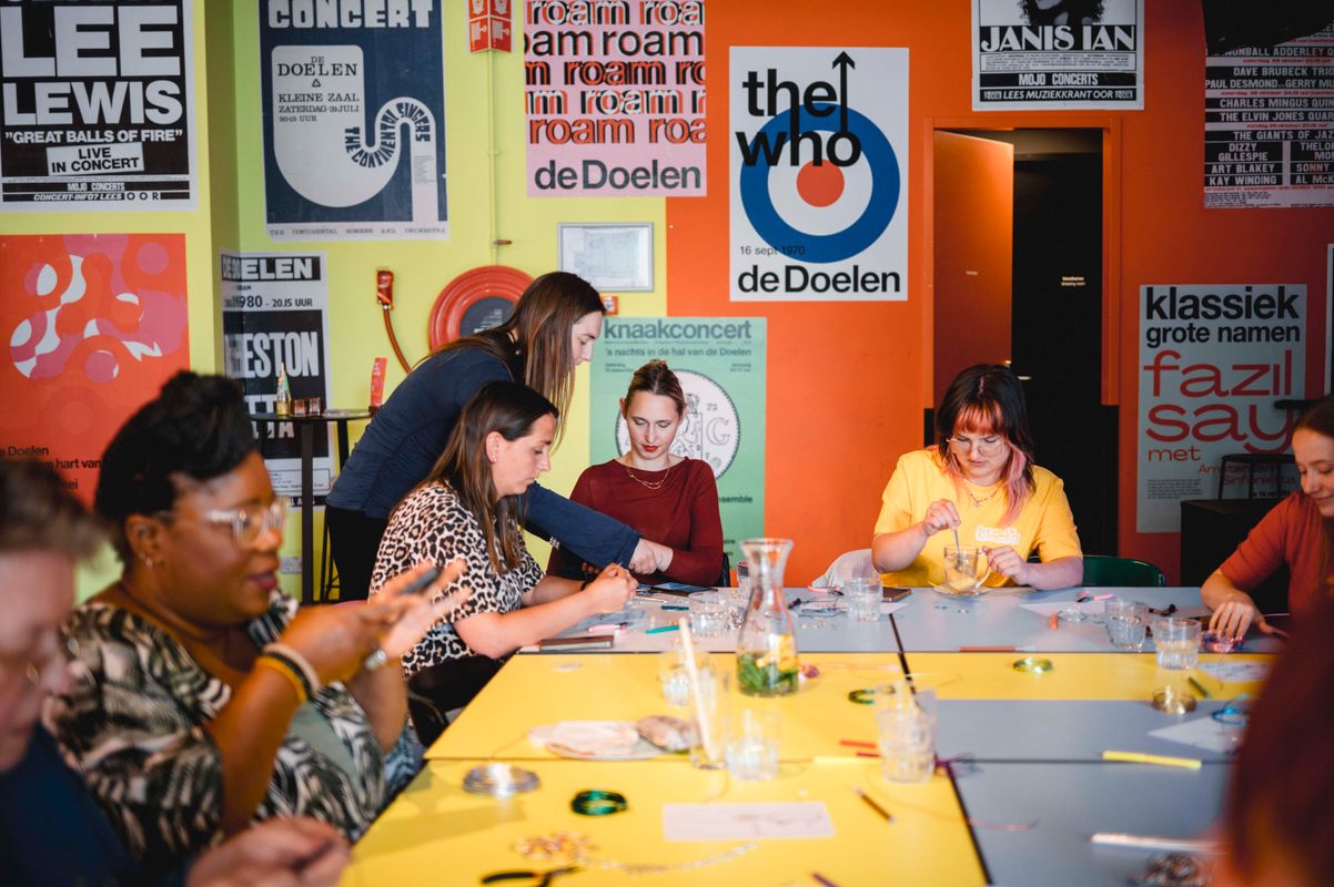 Een serie creatieve sessies in de Doelen Studio: Lilian Beentjes leerde deelnemers sieraden maken van aluminium, met oog voor detail en ruimte voor experiment.